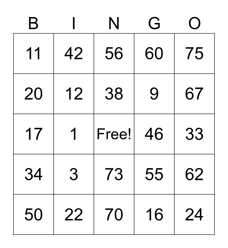 This bingo card has a free space and 24 words: 3, 22, 38, 50, 75, 11, 20, 42, 46, 73, 9, 17, 55, 62, 12, 16, 33, 56, 67, 1, 24, 34, 60 and 70.