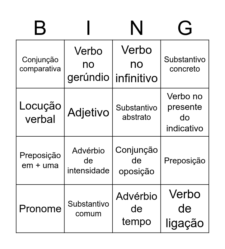 This bingo card has 16 words: Substantivo comum, Preposição, Verbo no infinitivo, Conjunção comparativa, Preposição em + uma, Verbo no gerúndio, Conjunção de oposição, Advérbio de tempo, Locução verbal, Adjetivo, Pronome, Substantivo concreto, Advérbio de intensidade, Verbo no presente do indicativo, Substantivo abstrato and Verbo de ligação.