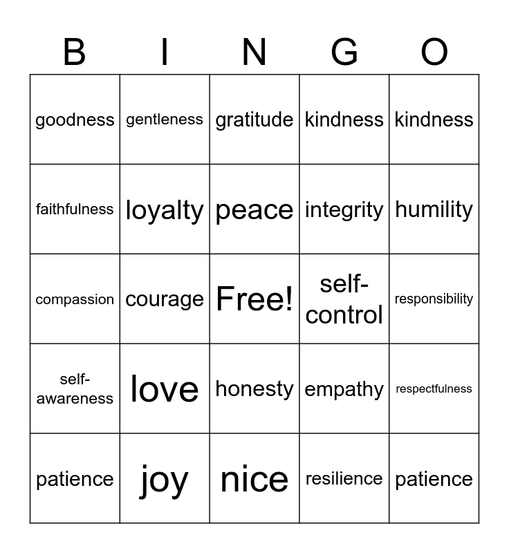 This bingo card has a free space and 24 words: love, joy, peace, patience, kindness, goodness, faithfulness, gentleness, self-control, honesty, integrity, compassion, empathy, respectfulness, loyalty, resilience, responsibility, gratitude, humility, courage, patience, self-awareness, kindness and nice.