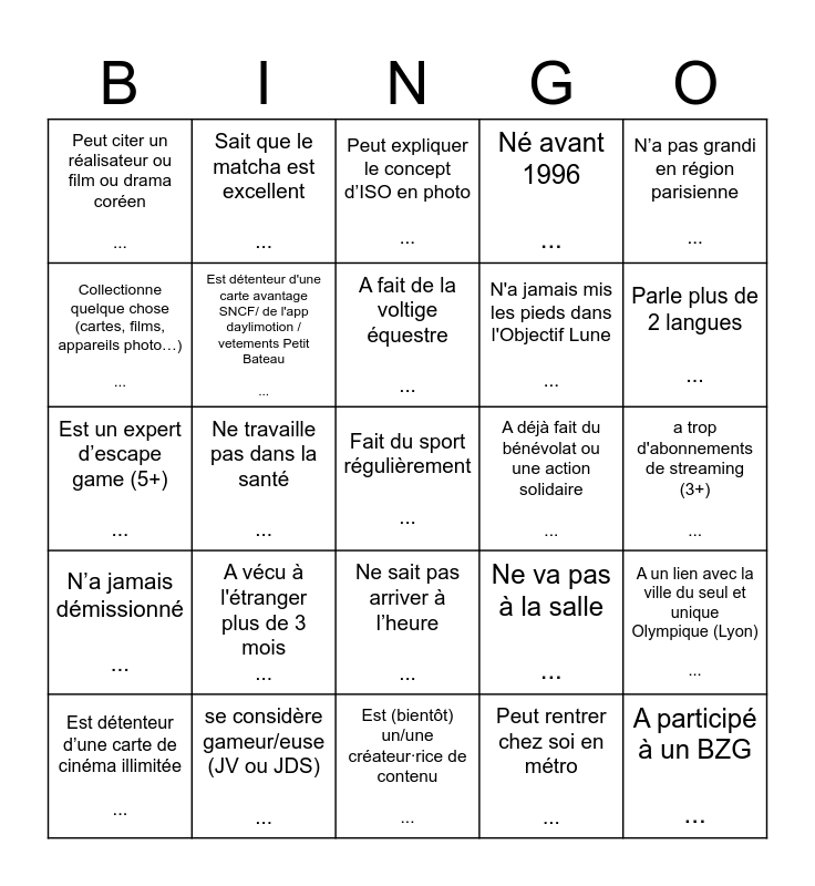 This bingo card has 25 words: A vécu à l'étranger plus de 3 mois ..., Est (bientôt) un/une créateur·rice de contenu ..., A fait de la voltige équestre ..., Est détenteur d’une carte de cinéma illimitée ..., N’a pas grandi en région parisienne ..., Peut citer un réalisateur ou film ou drama coréen ..., Collectionne quelque chose (cartes, films, appareils photo…) ..., Sait que le matcha est excellent ..., A déjà fait du bénévolat ou une action solidaire ..., Ne sait pas arriver à l’heure ..., N'a jamais mis les pieds dans l'Objectif Lune ..., Est un expert d’escape game (5+) ..., Ne va pas à la salle ..., A un lien avec la ville du seul et unique Olympique (Lyon) ..., Est détenteur d'une carte avantage SNCF/ de l'app daylimotion / vetements Petit Bateau ..., A participé à un BZG ..., a trop d'abonnements de streaming (3+) ..., Peut expliquer le concept d’ISO en photo ..., Parle plus de 2 langues ..., Ne travaille pas dans la santé ..., Fait du sport régulièrement ..., se considère gameur/euse (JV ou JDS) ..., N’a jamais démissionné ..., Né avant 1996 ... and Peut rentrer chez soi en métro ....