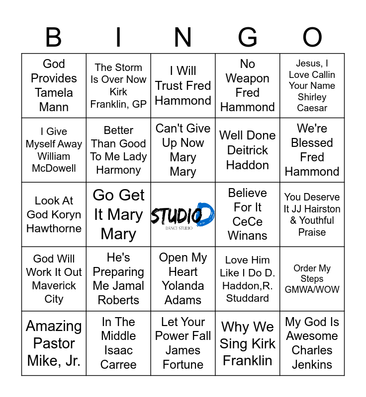 This bingo card has a free space and 40 words: God's Grace Trin-i-tee 5:7, Look At God Koryn Hawthorne, By Your Spirit Tasha Cobbs, Kierra Sheard, Better Than Good To Me Lady Harmony, In The Middle Isaac Carree, Open My Heart Yolanda Adams, Can't Give Up Now Mary Mary, Praise Him In Advance Marvin Sapp, Jesus, I Love Callin Your Name Shirley Caesar, God Will Work It Out Maverick City, Go Get It Mary Mary, No Weapon Fred Hammond, My God Is Awesome Charles Jenkins, You Deserve It JJ Hairston & Youthful Praise, Believe For It CeCe Winans, He's Preparing Me Jamal Roberts, Speak The Name K. Hawthorne,Natalie Grant, God Provides Tamela Mann, Unstoppable Koryn Hawthorne, I Will Trust Fred Hammond, Order My Steps GMWA/WOW, Why We Sing Kirk Franklin, Well Done Deitrick Haddon, I Give Myself Away William McDowell, Only One Night Tye Tribbett, This Place Tamela Mann, Work It Out For Me Zacardi Cortez, For Your Glory Tasha Cobbs, It's Working William Murphy, God Is Kanye West, Yes Harmony Dobson, Amazing Pastor Mike, Jr., All Things Kirk Franklin, Love Him Like I Do D. Haddon,R. Studdard, We're Blessed Fred Hammond, Let Your Power Fall James Fortune, Let Go DeWayne Woods, Father Can You Hear Me C.J. Harris, The Storm Is Over Now Kirk Franklin, GP and Have Your Way Fantasia.