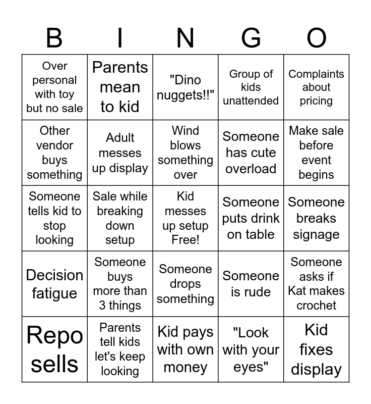 This bingo card has a free space and 24 words: Someone buys more than 3 things, Parents tell kids let's keep looking, Wind blows something over, Repo sells, Complaints about pricing, Over personal with toy but no sale, Other vendor buys something, Parents mean to kid, Someone puts drink on table, Someone drops something, Someone has cute overload, Someone tells kid to stop looking, Someone is rude, Someone asks if Kat makes crochet, Adult messes up display, "Look with your eyes", Someone breaks signage, "Dino nuggets!!", Make sale before event begins, Sale while breaking down setup, Kid fixes display, Decision fatigue, Group of kids unattended and Kid pays with own money.