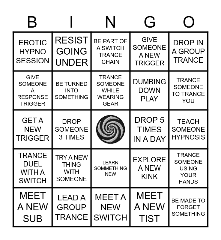 This bingo card has a free space and 24 words: TRY A NEW THING WITH SOMEONE, LEAD A GROUP TRANCE, TRANCE SOMEONE WHILE WEARING GEAR, MEET A NEW SUB, DROP IN A GROUP TRANCE, EROTIC HYPNO SESSION, GIVE SOMEONE A RESPONSE TRIGGER, RESIST GOING UNDER, DROP 5 TIMES IN A DAY, LEARN SOMMETHING NEW, DUMBING DOWN PLAY, GET A NEW TRIGGER, EXPLORE A NEW KINK, TRANCE SOMEONE USING YOUR HANDS, BE TURNED INTO SOMETHING, MEET A NEW TIST, TEACH SOMEONE HYPNOSIS, BE PART OF A SWITCH TRANCE CHAIN, TRANCE SOMEONE TO TRANCE YOU, DROP SOMEONE 3 TIMES, BE MADE TO FORGET SOMETHING, TRANCE DUEL WITH A SWITCH, GIVE SOMEONE A NEW TRIGGER and MEET A NEW SWITCH.