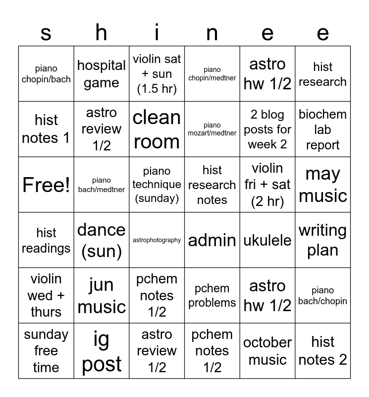 This bingo card has 36 words: pchem problems, pchem notes 1/2, pchem notes 1/2, hist notes 1, hist readings, hist research notes, astro review 1/2, astro review 1/2, astro hw 1/2, astro hw 1/2, biochem lab report, piano chopin/medtner, piano bach/chopin, piano bach/medtner, piano mozart/medtner, piano chopin/bach, violin wed + thurs, violin fri + sat (2 hr), Free!, violin sat + sun (1.5 hr), piano technique (sunday), dance (sun), admin, astrophotography, ukulele, hospital game, 2 blog posts for week 2, ig post, clean room, hist research, hist notes 2, sunday free time, writing plan, may music, jun music and october music.