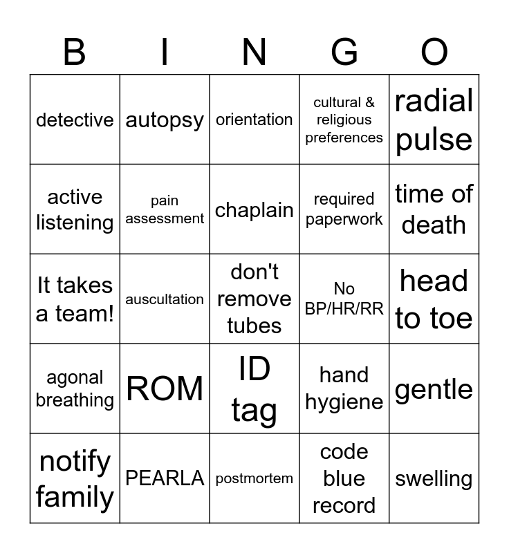 This bingo card has 25 words: ROM, postmortem, chaplain, notify family, radial pulse, detective, active listening, autopsy, No BP/HR/RR, ID tag, required paperwork, It takes a team!, hand hygiene, gentle, pain assessment, swelling, head to toe, orientation, time of death, auscultation, don't remove tubes, PEARLA, agonal breathing, cultural & religious preferences and code blue record.