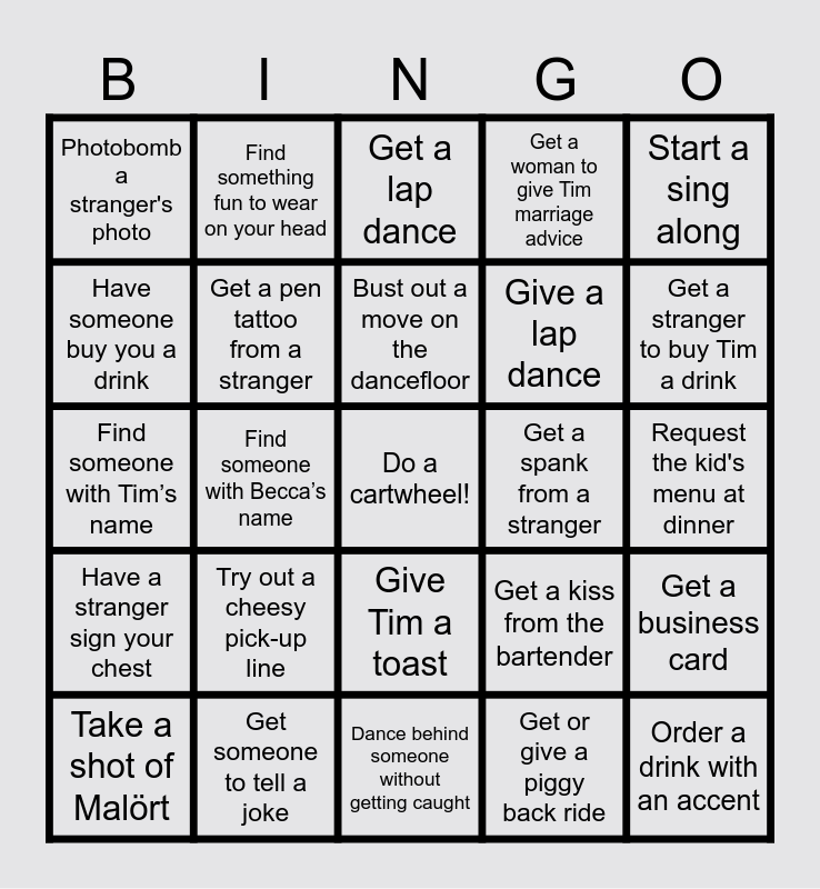 This bingo card has a free space and 24 words: Try out a cheesy pick-up line, Get someone to tell a joke, Bust out a move on the dancefloor, Take a shot of Malört, Start a sing along, Photobomb a stranger's photo, Have someone buy you a drink, Find something fun to wear on your head, Get a spank from a stranger, Give Tim a toast, Give a lap dance, Find someone with Tim’s name, Get a kiss from the bartender, Get a business card, Get a pen tattoo from a stranger, Get or give a piggy back ride, Request the kid's menu at dinner, Get a lap dance, Get a stranger to buy Tim a drink, Find someone with Becca’s name, Order a drink with an accent, Have a stranger sign your chest, Get a woman to give Tim marriage advice and Dance behind someone without getting caught.