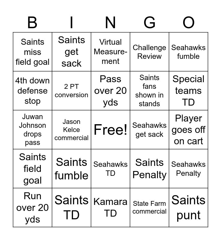 This bingo card has a free space and 24 words: Saints fumble, Saints TD, Pass over 20 yds, Run over 20 yds, Seahawks fumble, Saints miss field goal, 4th down defense stop, Saints get sack, Seahawks get sack, Seahawks TD, Saints fans shown in stands, Juwan Johnson drops pass, Saints Penalty, Seahawks Penalty, 2 PT conversion, State Farm commercial, Player goes off on cart, Virtual Measure-ment, Special teams TD, Jason Kelce commercial, Saints punt, Saints field goal, Challenge Review and Kamara TD.