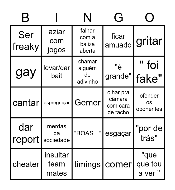 This bingo card has a free space and 24 words: merdas da sociedade, insultar team mates, chamar alguém de adivinho, cheater, gritar, Ser freaky, gay, aziar com jogos, olhar pra câmara com cara de tacho, "BOAS...", "é grande", cantar, esgaçar, "por de trás", levar/dar bait, comer, ofender os oponentes, falhar com a baliza aberta, " foi fake", espreguiçar, "que que tou a ver ", dar report, ficar amuado and timings.