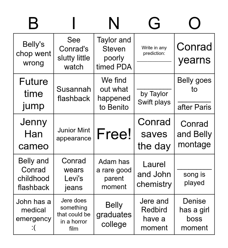 This bingo card has a free space and 24 words: Conrad wears Levi's jeans, Jere does something that could be in a horror film, We find out what happened to Benito, John has a medical emergency :(, Conrad yearns, Belly's chop went wrong, Future time jump, See Conrad's slutty little watch, Conrad saves the day, Adam has a rare good parent moment, _________ by Taylor Swift plays, Jenny Han cameo, Laurel and John chemistry, _________ song is played, Susannah flashback, Jere and Redbird have a moment, Conrad and Belly montage, Taylor and Steven poorly timed PDA, Belly goes to ________ after Paris, Junior Mint appearance, Denise has a girl boss moment, Belly and Conrad childhood flashback, Write in any prediction: _____________ and Belly graduates college.