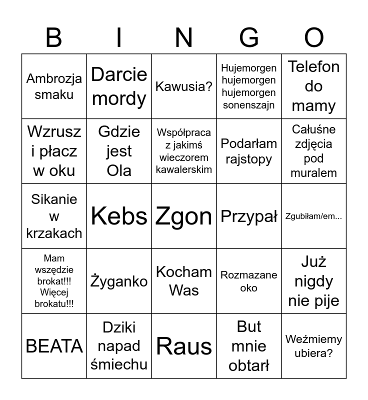 This bingo card has a free space and 24 words: Żyganko, Dziki napad śmiechu, Współpraca z jakimś wieczorem kawalerskim, BEATA, Telefon do mamy, Ambrozja smaku, Wzrusz i płacz w oku, Darcie mordy, Przypał, Kocham Was, Podarłam rajstopy, Sikanie w krzakach, Rozmazane oko, Już nigdy nie pije, Gdzie jest Ola, But mnie obtarł, Zgubiłam/em..., Kawusia?, Całuśne zdjęcia pod muralem, Kebs, Weźmiemy ubiera?, Mam wszędzie brokat!!! Więcej brokatu!!!, Hujemorgen hujemorgen hujemorgen sonenszajn and Raus.
