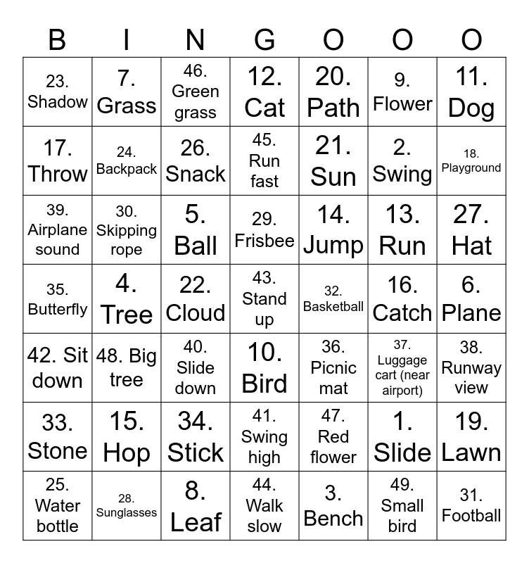 This bingo card has 49 words: 1. Slide, 2. Swing, 3. Bench, 4. Tree, 5. Ball, 6. Plane, 7. Grass, 8. Leaf, 9. Flower, 10. Bird, 11. Dog, 12. Cat, 13. Run, 14. Jump, 15. Hop, 16. Catch, 17. Throw, 18. Playground, 19. Lawn, 20. Path, 21. Sun, 22. Cloud, 23. Shadow, 24. Backpack, 25. Water bottle, 26. Snack, 27. Hat, 28. Sunglasses, 29. Frisbee, 30. Skipping rope, 31. Football, 32. Basketball, 33. Stone, 34. Stick, 35. Butterfly, 36. Picnic mat, 37. Luggage cart (near airport), 38. Runway view, 39. Airplane sound, 40. Slide down, 41. Swing high, 42. Sit down, 43. Stand up, 44. Walk slow, 45. Run fast, 46. Green grass, 47. Red flower, 48. Big tree and 49. Small bird.