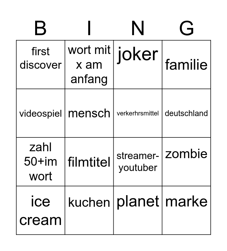 This bingo card has 16 words: kuchen, zombie, joker, first discover, zahl 50+im wort, wort mit x am anfang, streamer-youtuber, planet, videospiel, mensch, ice cream, familie, filmtitel, deutschland, verkerhrsmittel and marke.