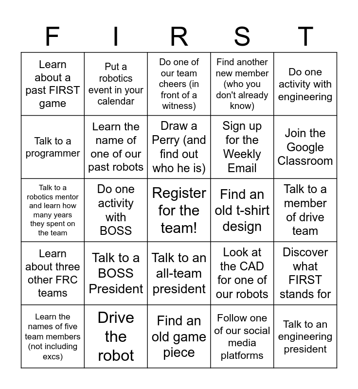 This bingo card has a free space and 24 words: Talk to a BOSS President, Drive the robot, Draw a Perry (and find out who he is), Learn the names of five team members (not including excs), Do one activity with engineering, Learn about a past FIRST game, Talk to a programmer, Put a robotics event in your calendar, Find an old t-shirt design, Talk to an all-team president, Sign up for the Weekly Email, Talk to a robotics mentor and learn how many years they spent on the team, Look at the CAD for one of our robots, Discover what FIRST stands for, Learn the name of one of our past robots, Follow one of our social media platforms, Talk to a member of drive team, Do one of our team cheers (in front of a witness), Join the Google Classroom, Do one activity with BOSS, Talk to an engineering president, Learn about three other FRC teams, Find another new member (who you don't already know) and Find an old game piece.