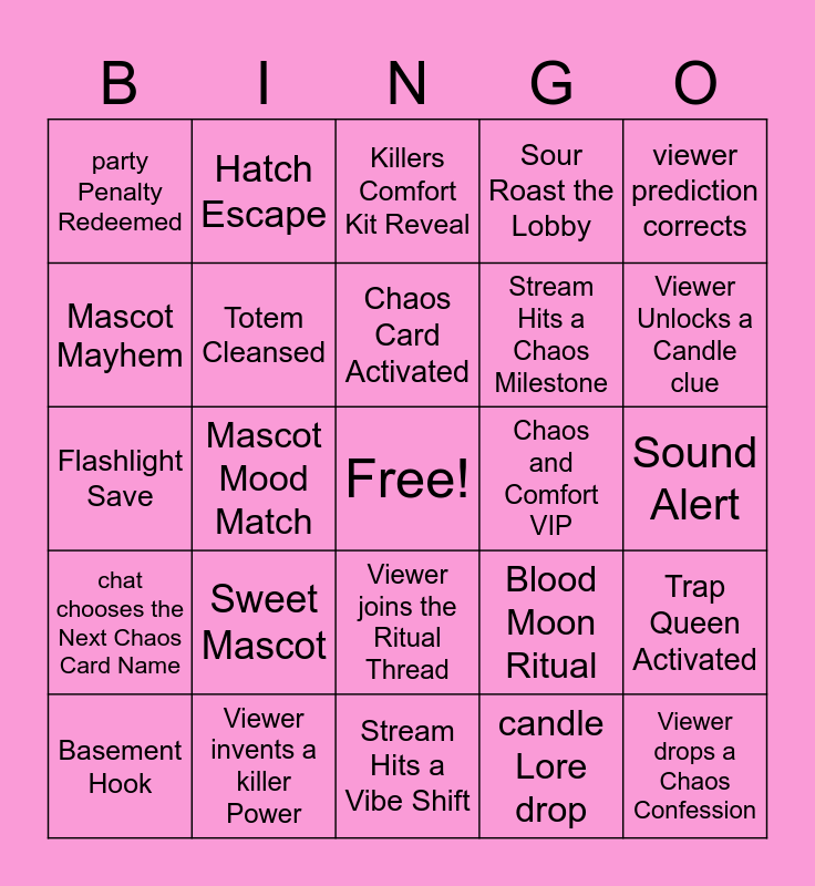 This bingo card has a free space and 24 words: Basement Hook, Sweet Mascot, Chaos Card Activated, candle Lore drop, viewer prediction corrects, party Penalty Redeemed, Hatch Escape, Killers Comfort Kit Reveal, Chaos and Comfort VIP, Sound Alert, Flashlight Save, Totem Cleansed, Blood Moon Ritual, Trap Queen Activated, Mascot Mayhem, Viewer invents a killer Power, Stream Hits a Vibe Shift, Sour Roast the Lobby, Viewer Unlocks a Candle clue, chat chooses the Next Chaos Card Name, Mascot Mood Match, Viewer joins the Ritual Thread, Stream Hits a Chaos Milestone and Viewer drops a Chaos Confession.
