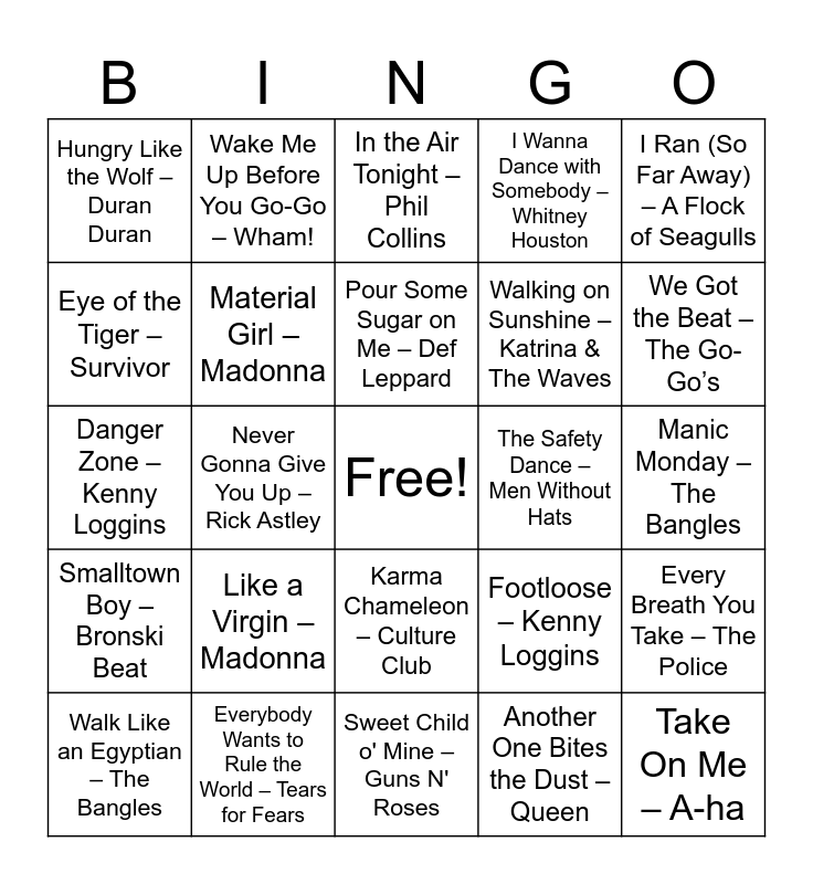 This bingo card has a free space and 50 words: Billie Jean – Michael Jackson, Take On Me – A-ha, Girls Just Want to Have Fun – Cyndi Lauper, Sweet Child o' Mine – Guns N' Roses, Like a Virgin – Madonna, Africa – Toto, Wake Me Up Before You Go-Go – Wham!, Don’t Stop Believin’ – Journey, Eye of the Tiger – Survivor, Livin’ on a Prayer – Bon Jovi, Material Girl – Madonna, I Wanna Dance with Somebody – Whitney Houston, Every Breath You Take – The Police, Footloose – Kenny Loggins, You Spin Me Round (Like a Record) – Dead or Alive, Beat It – Michael Jackson, Pour Some Sugar on Me – Def Leppard, The Safety Dance – Men Without Hats, Should I Stay or Should I Go – The Clash, I Ran (So Far Away) – A Flock of Seagulls, Never Gonna Give You Up – Rick Astley, Another One Bites the Dust – Queen, Hungry Like the Wolf – Duran Duran, Walking on Sunshine – Katrina & The Waves, Let’s Dance – David Bowie, Come On Eileen – Dexys Midnight Runners, We Got the Beat – The Go-Go’s, Jessie’s Girl – Rick Springfield, In the Air Tonight – Phil Collins, Karma Chameleon – Culture Club, 867-5309 / Jenny – Tommy Tutone, Just Can’t Get Enough – Depeche Mode, Tainted Love – Soft Cell, With or Without You – U2, Everybody Wants to Rule the World – Tears for Fears, Rock the Casbah – The Clash, Time After Time – Cyndi Lauper, She Drives Me Crazy – Fine Young Cannibals, Bizarre Love Triangle – New Order, Manic Monday – The Bangles, Rhythm of the Night – DeBarge, Let’s Hear It for the Boy – Deniece Williams, Private Eyes – Hall & Oates, I Love Rock 'n Roll – Joan Jett & the Blackhearts, Walk Like an Egyptian – The Bangles, Danger Zone – Kenny Loggins, Faithfully – Journey, Sharp Dressed Man – ZZ Top, Smalltown Boy – Bronski Beat and Under Pressure – Queen & David Bowie.