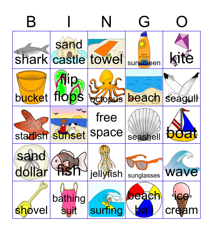 This bingo card has 28 images, a free space and 28 words: wave, sand, beach, beach ball, bucket, towel, sand castle, sand dollar, seashell, shovel, starfish, sunscreen, bathing suit, surfing, seagull, hermit crab, fish, flip flops, octopus, jellyfish, shark, whale, ice cream, sunset, boat, sunglasses, kite and seaweed.