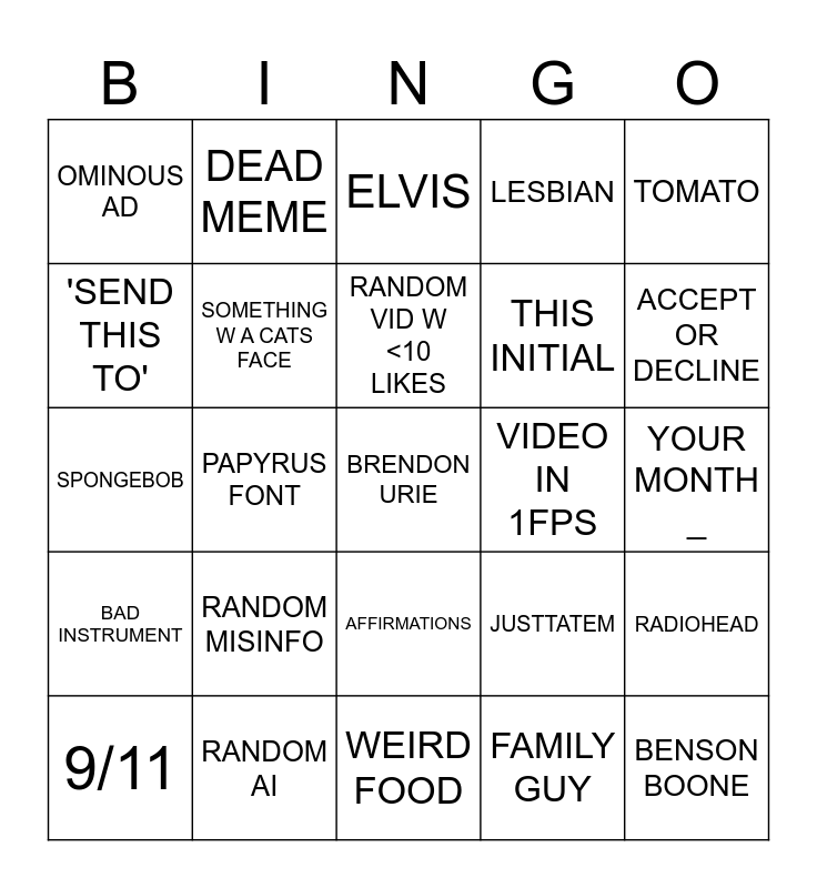 This bingo card has 25 words: RANDOM MISINFO, WEIRD FOOD, RANDOM VID W <10 LIKES, 9/11, TOMATO, OMINOUS AD, 'SEND THIS TO', DEAD MEME, VIDEO IN 1FPS, AFFIRMATIONS, THIS INITIAL, SPONGEBOB, JUSTTATEM, RADIOHEAD, SOMETHING W A CATS FACE, BENSON BOONE, YOUR MONTH _, ELVIS, ACCEPT OR DECLINE, PAPYRUS FONT, BRENDON URIE, RANDOM AI, BAD INSTRUMENT, LESBIAN and FAMILY GUY.