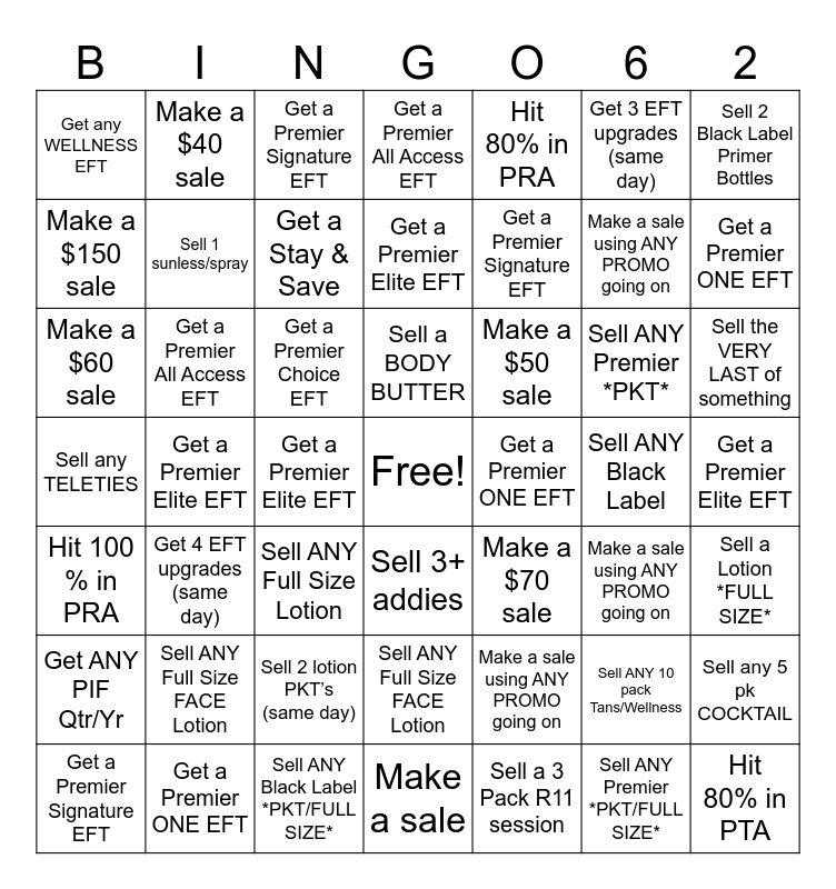 This bingo card has a free space and 135 words: Sell a Lightstim sheet mask, Sell 3pk/box Lightstim sheet mask, Sell any 5 pk COCKTAIL, Sell City Lips, Sell a CANDLE, Sell any TELETIES, Sell the VERY LAST of something, Sell ANY Premier *FULL SIZE*, Sell ANY Premier *PKT*, Sell ANY Premier *PKT/FULL SIZE*, Sell ANY Black Label *FULL SIZE*, Sell ANY Black Label *PKT*, Sell ANY Black Label *PKT/FULL SIZE*, Sell ANY Black Label *FULL SIZE*, Sell ANY Spray Your Way, Sell ANY Black Label, Sell ANY Full Size Lotion, *UPG*- ANY EFT, Get a Premier All Access EFT, Get a Premier All Access EFT, Get a Premier Elite EFT, Get a Premier Elite EFT, Get a Premier Signature EFT, Get a Premier Signature EFT, Get a Premier Choice EFT, Get a Premier Choice EFT, Get a Premier ONE EFT, Get a Premier ONE EFT, Sell 1 sunless/spray, Get a Premier All Access EFT, Get a Premier All Access EFT, Get a Premier Elite EFT, Get a Premier Elite EFT, Get a Premier Signature EFT, Get a Premier Signature EFT, Get a Premier Choice EFT, Get a Premier Choice EFT, Get a Premier ONE EFT, Get a Premier ONE EFT, Sell a B1G1 SPRAY, Make a sale using ANY PROMO going on, Sell ANY supplement, Sell L'obsidiennex, Sell City Lips, Sell a CANDLE, Sell any TELETIES, Sell the VERY LAST of something, Sell ANY Full Size FACE Lotion, Sell a BODY BUTTER, Sell ANY RESTORED product, Sell ANY Tan Extender, Sell a Lotion *FULL SIZE*, Sell a Lotion *PKT*, Sell a Lotion *FULL SIZE*, Sell a Lotion *ะ ะะข*, Sell ANY lotion PKT, Hit 70% in PTA, Hit 70% in PRA, Hit 75% in PTA, Hit 75% in PRA, Hit 80% in PTA, Hit 80% in PRA, Hit 90% in PTA, Hit 90% in PRA, Hit 100% in PTA, Hit 100 % in PRA, Make a $10 sale, Make a $15 sale, Make a $20 sale, Make a $40 sale, Make a $50 sale, Make a $60 sale, Make a $70 sale, Make a $80 sale, Make a $90 sale, Make a $100+ sale, Make a $150 sale, Make a sale, Get any WELLNESS EFT, Get ANY PIF Qtr/Yr, Get a Premier All Access EFT, Get a Premier All Access EFT, Get a Premier Elite EFT, Get a Premier Elite EFT, Get a Premier Signature EFT, Get a Premier Signature EFT, Get a Premier Choice EFT, Get a Premier Choice EFT, Get a Premier ONE EFT, Get a Premier ONE EFT, Get 4 EFT upgrades (same day), Get 3 EFT upgrades (same day), *UPG* ANY EFT, *UPG* ANY EFT, Sell 1 R11 session, Sell a 3 Pack R11 session, Sell any 2 pack sessions, Pick a PKT, Pick a BED (on WEDNESDAY), Pick a PKT, Pick a BED (on WEDNESDAY), Sell ANY 3 pack Tans/Wellness, Sell ANY 10 pack Tans/Wellness, Sell 1 sunless/spray, Spray w/ 2+ addies, Spray w/ 3+ addies, Sell 1 (or more) addies, Sell 3+ addies, Sell 5+ addies, Sell ANY supplement, Sell ANY Premier *PKT*, Sell ANY Premier *PKT/FULL SIZE*, Sell ANY Black Label *FULL SIZE*, Sell 2 Black Label Primer Bottles, Sell ANY Black Label *FULL SIZE*, Sell ANY Spray Your Way, Sell ANY Black Label, Sell ANY Full Size Lotion, Sell ANY Full Size FACE Lotion, Sell ANY RESTORED, Sell ANY Tan Extender, Sell a Lotion *FULL SIZE*, Sell a Lotion *PKT*, Sell an Lotion *FULL SIZE*, Sell a Lotion *PKT*, Sell a Lotion *FULL SIZE*, Sell Lotion *PKT*, Sell 2 lotion PKTโs (same day), Make a sale using ANY PROMO going on, Make a sale using ANY PROMO going on, Make a sale using ANY PROMO going on, Make a sale using ANY PROMO going on, Make a sale using ANY PROMO going on, Get an EFT unfreeze, Get an EFT unfreeze, Get a Stay & Save and Get a Stay & Save.