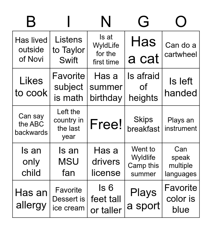 This bingo card has a free space and 24 words: Is an MSU fan, Favorite Dessert is ice cream, Has a summer birthday, Has an allergy, Can do a cartwheel, Has lived outside of Novi, Likes to cook, Listens to Taylor Swift, Skips breakfast, Has a drivers license, Is afraid of heights, Can say the ABC backwards, Went to Wyldlife Camp this summer, Can speak multiple languages, Favorite subject is math, Plays a sport, Plays an instrument, Is at WyldLife for the first time, Is left handed, Left the country in the last year, Favorite color is blue, Is an only child, Has a cat and Is 6 feet tall or taller.