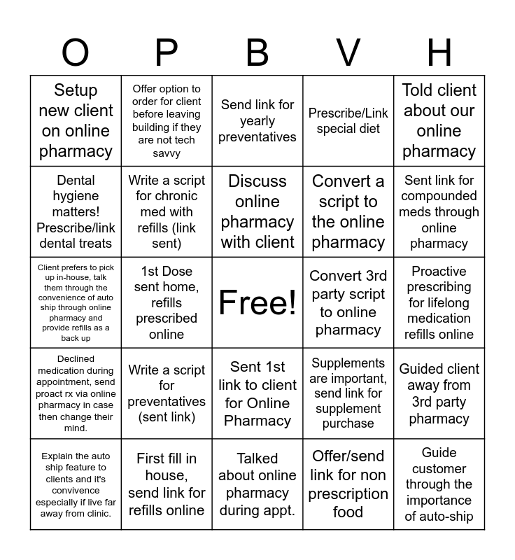 This bingo card has a free space and 24 words: Write a script for preventatives (sent link), First fill in house, send link for refills online, Discuss online pharmacy with client, Explain the auto ship feature to clients and it's convivence especially if live far away from clinic., Told client about our online pharmacy, Setup new client on online pharmacy, Dental hygiene matters! Prescribe/link dental treats, Offer option to order for client before leaving building if they are not tech savvy, Convert 3rd party script to online pharmacy, Sent 1st link to client for Online Pharmacy, Convert a script to the online pharmacy, Client prefers to pick up in-house, talk them through the convenience of auto ship through online pharmacy and provide refills as a back up, Supplements are important, send link for supplement purchase, Guided client away from 3rd party pharmacy, Write a script for chronic med with refills (link sent), Offer/send link for non prescription food, Proactive prescribing for lifelong medication refills online, Send link for yearly preventatives, Sent link for compounded meds through online pharmacy, 1st Dose sent home, refills prescribed online, Guide customer through the importance of auto-ship, Declined medication during appointment, send proact rx via online pharmacy in case then change their mind., Prescribe/Link special diet and Talked about online pharmacy during appt..
