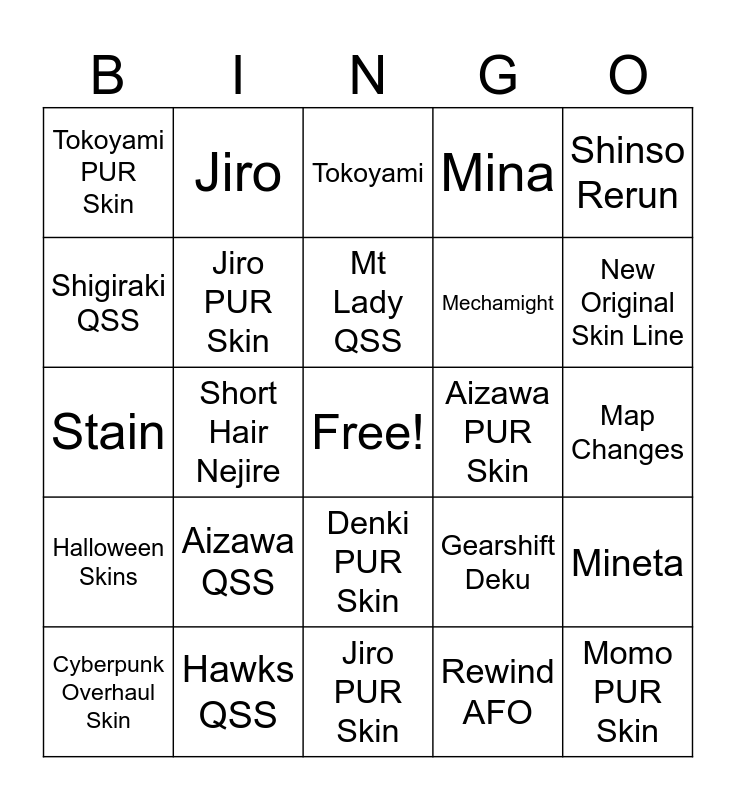This bingo card has a free space and 24 words: Aizawa QSS, Hawks QSS, Mt Lady QSS, Cyberpunk Overhaul Skin, Shinso Rerun, Tokoyami PUR Skin, Shigiraki QSS, Jiro, Aizawa PUR Skin, Denki PUR Skin, Mechamight, Stain, Gearshift Deku, Mineta, Jiro PUR Skin, Rewind AFO, Map Changes, Tokoyami, New Original Skin Line, Short Hair Nejire, Momo PUR Skin, Halloween Skins, Mina and Jiro PUR Skin.