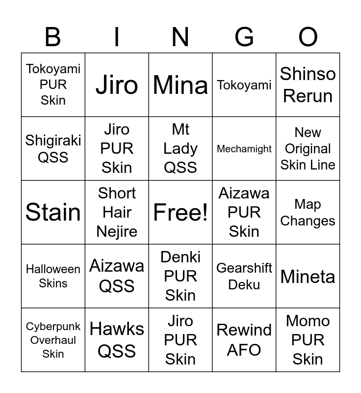 This bingo card has a free space and 24 words: Aizawa QSS, Hawks QSS, Mt Lady QSS, Cyberpunk Overhaul Skin, Shinso Rerun, Tokoyami PUR Skin, Shigiraki QSS, Jiro, Aizawa PUR Skin, Denki PUR Skin, Mechamight, Stain, Gearshift Deku, Mineta, Jiro PUR Skin, Rewind AFO, Map Changes, Mina, New Original Skin Line, Short Hair Nejire, Momo PUR Skin, Halloween Skins, Tokoyami and Jiro PUR Skin.