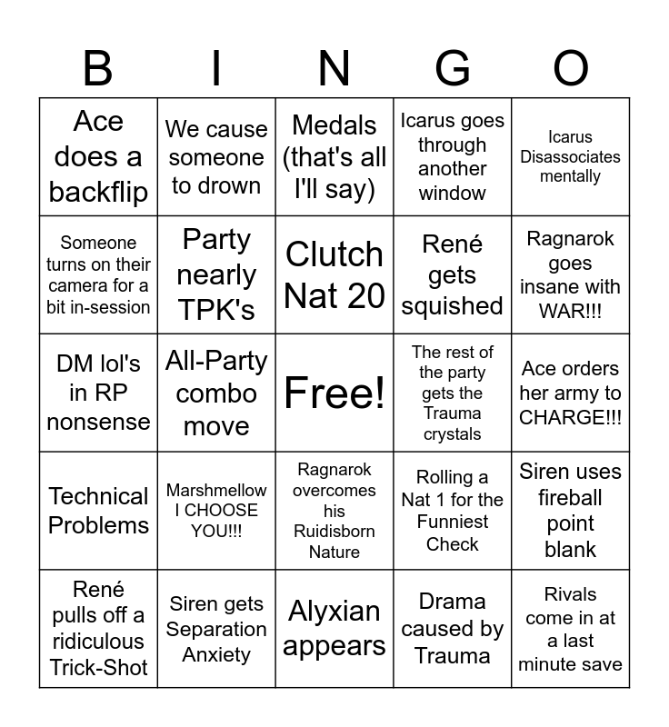 This bingo card has a free space and 24 words: Marshmellow I CHOOSE YOU!!!, Siren gets Separation Anxiety, Clutch Nat 20, René pulls off a ridiculous Trick-Shot, Icarus Disassociates mentally, Ace does a backflip, Someone turns on their camera for a bit in-session, We cause someone to drown, The rest of the party gets the Trauma crystals, Ragnarok overcomes his Ruidisborn Nature, René gets squished, DM lol's in RP nonsense, Rolling a Nat 1 for the Funniest Check, Siren uses fireball point blank, Party nearly TPK's, Drama caused by Trauma, Ace orders her army to CHARGE!!!, Medals (that's all I'll say), Ragnarok goes insane with WAR!!!, All-Party combo move, Rivals come in at a last minute save, Technical Problems, Icarus goes through another window and Alyxian appears.