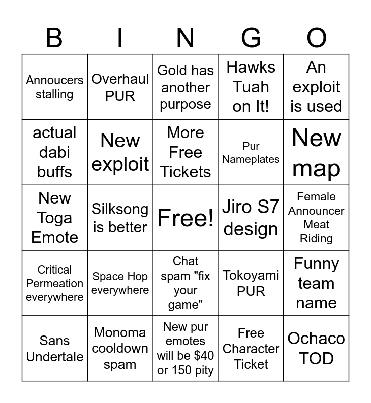 This bingo card has a free space and 24 words: Space Hop everywhere, Monoma cooldown spam, More Free Tickets, Sans Undertale, An exploit is used, Annoucers stalling, actual dabi buffs, Overhaul PUR, Jiro S7 design, Chat spam "fix your game", Pur Nameplates, New Toga Emote, Tokoyami PUR, Funny team name, New exploit, Free Character Ticket, Female Announcer Meat Riding, Gold has another purpose, New map, Silksong is better, Ochaco TOD, Critical Permeation everywhere, Hawks Tuah on It! and New pur emotes will be $40 or 150 pity.