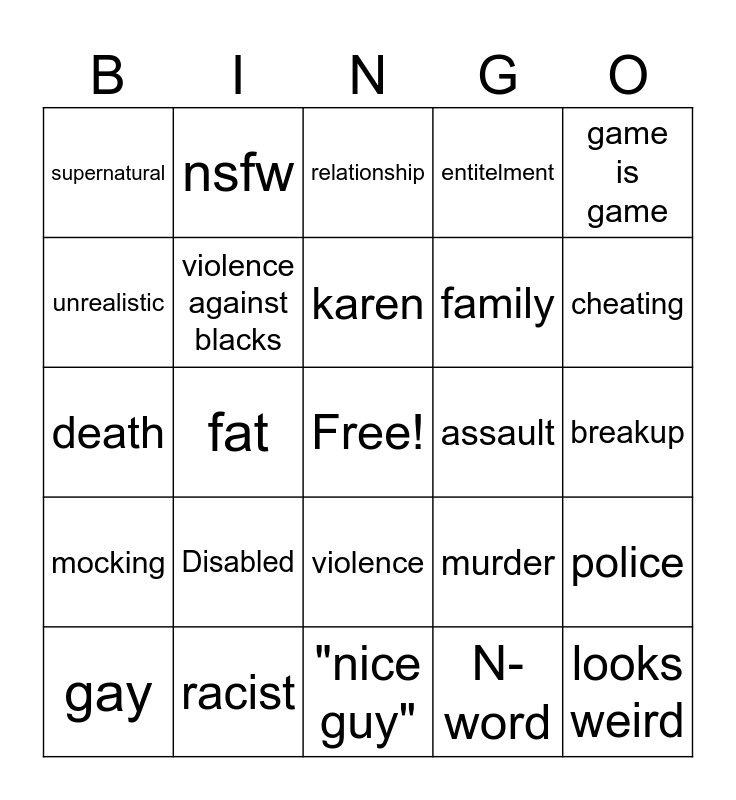 This bingo card has a free space and 24 words: Disabled, racist, karen, gay, game is game, supernatural, unrealistic, nsfw, assault, violence, family, death, murder, police, violence against blacks, N-word, breakup, relationship, cheating, fat, looks weird, mocking, entitelment and "nice guy".