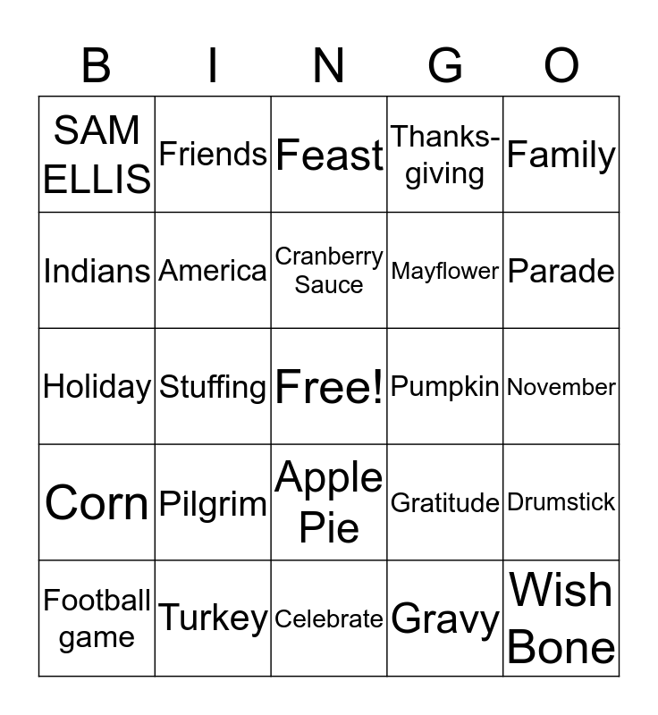 This bingo card has a free space and 24 words: Pilgrim, Turkey, Cranberry Sauce, Football game, Family, SAM ELLIS, Indians, Friends, Pumpkin, Apple Pie, Mayflower, Holiday, Gratitude, Drumstick, America, Gravy, November, Feast, Parade, Stuffing, Wish Bone, Corn, Thanks- giving and Celebrate.