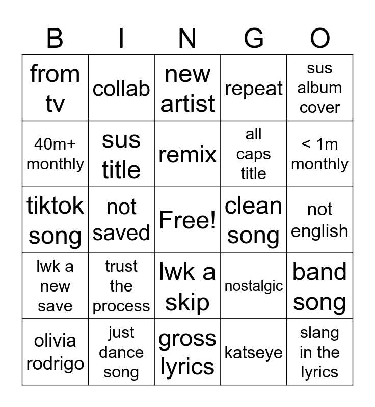 This bingo card has a free space and 24 words: trust the process, just dance song, remix, olivia rodrigo, sus album cover, from tv, 40m+ monthly, collab, clean song, lwk a skip, all caps title, tiktok song, nostalgic, band song, sus title, katseye, not english, new artist, < 1m monthly, not saved, slang in the lyrics, lwk a new save, repeat and gross lyrics.