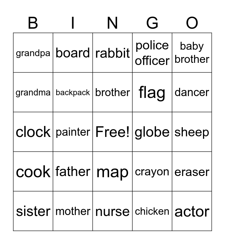 This bingo card has a free space and 24 words: father, mother, brother, sister, baby brother, grandpa, grandma, board, globe, map, flag, clock, crayon, eraser, backpack, chicken, sheep, rabbit, dancer, painter, actor, cook, police officer and nurse.
