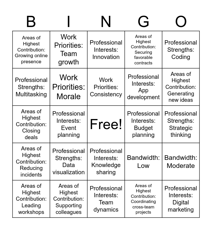 This bingo card has a free space and 123 words: Areas of Highest Contribution: Shaping business strategy, Work Priorities: Clarity, Bandwidth: High, Professional Interests: Long-term planning, Areas of Highest Contribution: Mediating disputes, Professional Strengths: Empathy, Work Priorities: Team growth, Areas of Highest Contribution: Building partnerships, Professional Interests: Team dynamics, Work Priorities: Quality, Areas of Highest Contribution: Building new tools, Professional Strengths: Sales, Work Priorities: Risk management, Professional Strengths: Organization, Professional Interests: Documentation, Work Priorities: Cost savings, Areas of Highest Contribution: Leading workshops, Professional Strengths: Research, Professional Strengths: Conflict resolution, Professional Interests: New technology, Areas of Highest Contribution: Coordinating cross-team projects, Work Priorities: Consistency, Areas of Highest Contribution: Creating training materials, Professional Interests: Process audits, Areas of Highest Contribution: Resolving IT issues, Areas of Highest Contribution: Securing favorable contracts, Areas of Highest Contribution: Supporting colleagues, Areas of Highest Contribution: Retaining key clients, Areas of Highest Contribution: Advising on compliance, Professional Strengths: Data analysis, Professional Interests: Problem-solving, Areas of Highest Contribution: Closing deals, Areas of Highest Contribution: Reducing incidents, Professional Strengths: Networking, Professional Interests: Regulatory updates, Work Priorities: Innovation, Professional Interests: Customer engagement, Professional Strengths: Scheduling, Professional Strengths: Customer service, Professional Strengths: Technical troubleshooting, Bandwidth: Low, Areas of Highest Contribution: Handling urgent requests, Professional Strengths: Creative problem-solving, Professional Interests: Branding, Work Priorities: Fiscal discipline, Professional Strengths: Relationship building, Areas of Highest Contribution: Coordinating company events, Professional Interests: Employee well-being, Professional Strengths: Visual design, Professional Strengths: Data visualization, Work Priorities: Responsiveness, Professional Strengths: Presentation skills, Professional Interests: Employee development, Professional Interests: Industry events, Work Priorities: Harmony, Work Priorities: Accuracy, Work Priorities: Attention to detail, Professional Strengths: Risk assessment, Professional Interests: Storytelling, Professional Strengths: Policy analysis, Professional Strengths: Project management, Work Priorities: Impact, Areas of Highest Contribution: Leading client presentations, Work Priorities: Revenue, Work Priorities: Efficiency, Professional Interests: Budget planning, Professional Strengths: Training, Areas of Highest Contribution: Ensuring standards are met, Professional Strengths: Strategic thinking, Professional Interests: Vendor relations, Professional Interests: Process improvement, Professional Strengths: Coaching, Professional Interests: Innovation, Work Priorities: Experimentation, Professional Strengths: Quality assurance, Work Priorities: On-time delivery, Professional Interests: Public speaking, Professional Strengths: Coding, Work Priorities: Delivery, Work Priorities: Flexibility, Professional Strengths: Financial modeling, Areas of Highest Contribution: Polishing communications, Bandwidth: Moderate, Professional Strengths: Multitasking, Professional Strengths: Social media, Professional Strengths: Negotiation, Professional Interests: App development, Professional Interests: Product launches, Work Priorities: Stakeholder alignment, Professional Interests: Fast-paced work, Areas of Highest Contribution: Forecasting and budgeting, Professional Interests: Safety protocols, Work Priorities: Morale, Professional Interests: Digital marketing, Professional Strengths: Logistics, Work Priorities: Staying informed, Work Priorities: Compliance, Areas of Highest Contribution: Creating compelling dashboards, Work Priorities: Engagement, Professional Interests: Supply chain, Professional Interests: Knowledge sharing, Areas of Highest Contribution: Streamlining reporting, Areas of Highest Contribution: Growing online presence, Areas of Highest Contribution: Optimizing team schedules, Areas of Highest Contribution: Resolving customer issues, Areas of Highest Contribution: Managing shipments, Professional Interests: Event planning, Work Priorities: Expanding contacts, Professional Interests: Content creation, Professional Interests: Calendar management, Work Priorities: Uptime, Professional Strengths: Editing, Areas of Highest Contribution: Designing marketing materials, Work Priorities: Growth, Areas of Highest Contribution: Mentoring new hires, Work Priorities: Satisfaction, Work Priorities: Prevention, Professional Strengths: Written communication, Areas of Highest Contribution: Providing competitive insights, Professional Interests: Market trends, Professional Interests: Systems optimization, Areas of Highest Contribution: Generating new ideas and Work Priorities: Skill development.