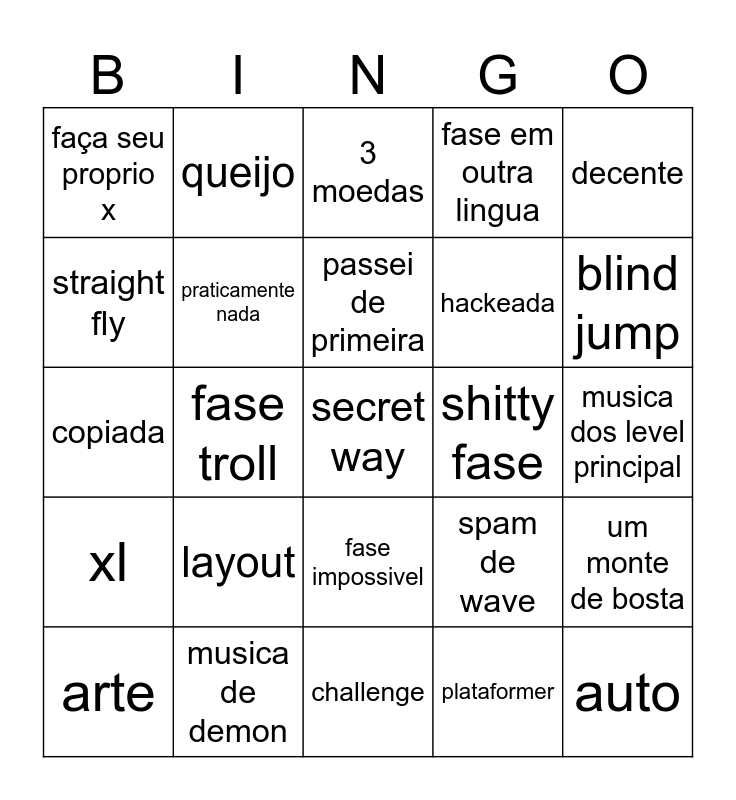 This bingo card has a free space and 24 words: layout, musica de demon, passei de primeira, arte, decente, faça seu proprio x, straight fly, queijo, shitty fase, fase impossivel, hackeada, copiada, spam de wave, um monte de bosta, praticamente nada, plataformer, musica dos level principal, 3 moedas, blind jump, fase troll, auto, xl, fase em outra lingua and challenge.