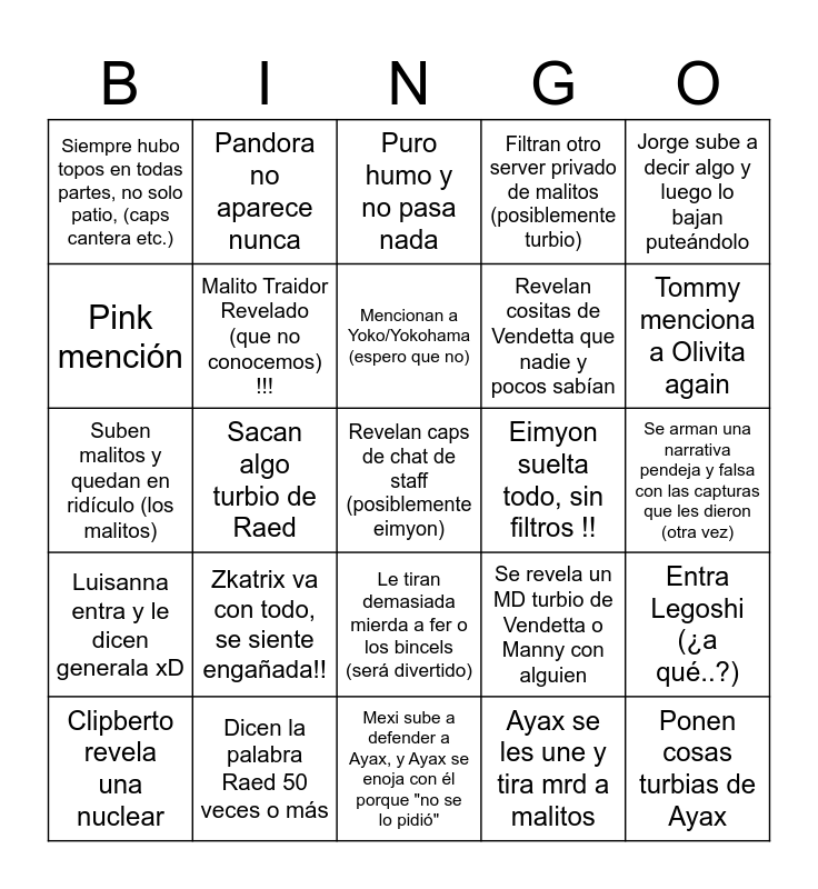 This bingo card has a free space and 24 words: Zkatrix va con todo, se siente engañada!!, Dicen la palabra Raed 50 veces o más, Mencionan a Yoko/Yokohama (espero que no), Clipberto revela una nuclear, Jorge sube a decir algo y luego lo bajan puteándolo, Siempre hubo topos en todas partes, no solo patio, (caps cantera etc.), Pink mención, Pandora no aparece nunca, Eimyon suelta todo, sin filtros !!, Le tiran demasiada mierda a fer o los bincels (será divertido), Revelan cositas de Vendetta que nadie y pocos sabían, Suben malitos y quedan en ridículo (los malitos), Se revela un MD turbio de Vendetta o Manny con alguien, Entra Legoshi (¿a qué..?), Malito Traidor Revelado (que no conocemos) !!!, Ayax se les une y tira mrd a malitos, Se arman una narrativa pendeja y falsa con las capturas que les dieron (otra vez), Puro humo y no pasa nada, Tommy menciona a Olivita again, Sacan algo turbio de Raed, Ponen cosas turbias de Ayax, Luisanna entra y le dicen generala xD, Filtran otro server privado de malitos (posiblemente turbio) and Mexi sube a defender a Ayax, y Ayax se enoja con él porque "no se lo pidió".
