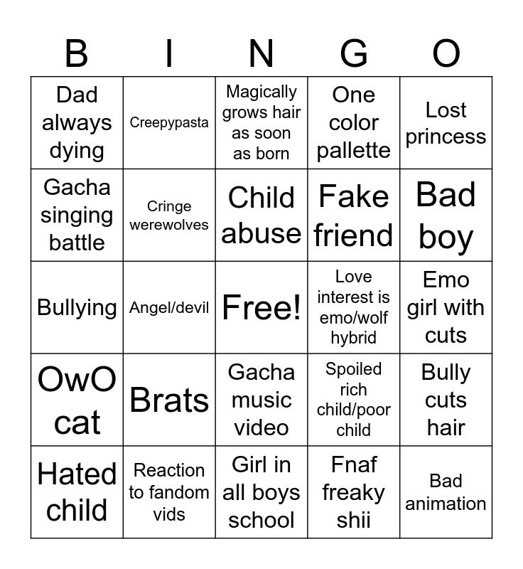 This bingo card has a free space and 24 words: Hated child, Brats, Child abuse, Fnaf freaky shii, Lost princess, Dad always dying, Creepypasta, Magically grows hair as soon as born, Love interest is emo/wolf hybrid, Emo girl with cuts, Bullying, Cringe werewolves, Spoiled rich child/poor child, Bully cuts hair, Gacha singing battle, Reaction to fandom vids, Girl in all boys school, One color pallette, Bad boy, OwO cat, Angel/devil, Gacha music video, Fake friend and Bad animation.