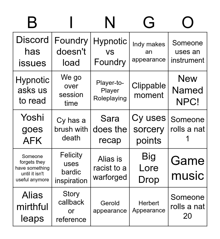 This bingo card has a free space and 29 words: Alias mirthful leaps, Fennik misses, Cy has a brush with death, Beta's late, Discord has issues, Hypnotic vs Foundry, We go over session time, Felicity uses bardic inspiration, Cy uses sorcery points, Story callback or reference, Someone rolls a nat 1, Someone rolls a nat 20, Gerold appearance, Herbert Appearance, New Named NPC!, Fun new game mechanic!, Alias is racist to a warforged, Someone forgets they have something until it isn't useful anymore, Someone uses an instrument, Yoshi goes AFK, Big Lore Drop, Someone uses inspiration!, Clippable moment, Hypnotic asks us to read, Indy makes an appearance, Foundry doesn't load, Game music, Player-to-Player Roleplaying and Foundry Function Struggles.