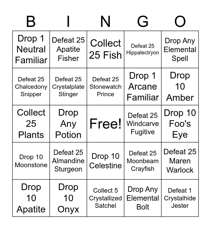 This bingo card has a free space and 48 words: Collect 5 Azurite, Defeat 1 Crystalhide Jester, Defeat 1 Hawksbill Goliath, Collect 5 Crystallized Satchel, Defeat 25 Almandine Sturgeon, Defeat 25 Amber Gulper, Defeat 25 Apatite Fisher, Defeat 25 Arctic Hippalectryon, Defeat 25 Chalcedony Snipper, Defeat 25 Clearwater Oracle, Defeat 25 Crystalplate Stinger, Defeat 25 Hippalectryon, Defeat 25 Maren Warlock, Defeat 25 Moonbeam Crayfish, Defeat 25 Rhodochrosite Crane, Defeat 25 Sparkling Stinger, Defeat 25 Stonewatch Prince, Defeat 25 Windcarve Fugitive, Drop Any Apparel Piece, Drop Any Elemental Spell, Drop Any Potion, Drop Any Elemental Bolt, Drop 1 Neutral Familiar, Drop 1 Arcane Familiar, Collect 10 Almandine, Drop 10 Amber, Drop 10 Apatite, Drop 10 Pink Chalcedony, Drop 10 Celestine, Drop 10 Moonstone, Drop 10 Chrysoberyl, Drop 5 Kunzite, Drop 10 Morganite, Drop 10 Bloodstone, Drop 10 Onyx, Drop 10 Rhodochrosite, Drop 10 Emerald, Drop 10 Foo's Eye, Drop 10 Prehnite, Drop Any Might Fragment, Drop Any Acuity Fragment, Drop Any Hybrid Fragment, Collect 25 Fish, Collect 25 Meat, Collect 25 Plants, Collect 25 Insects, Collect 25 Magical Shards and Collect Any Fest Chest.