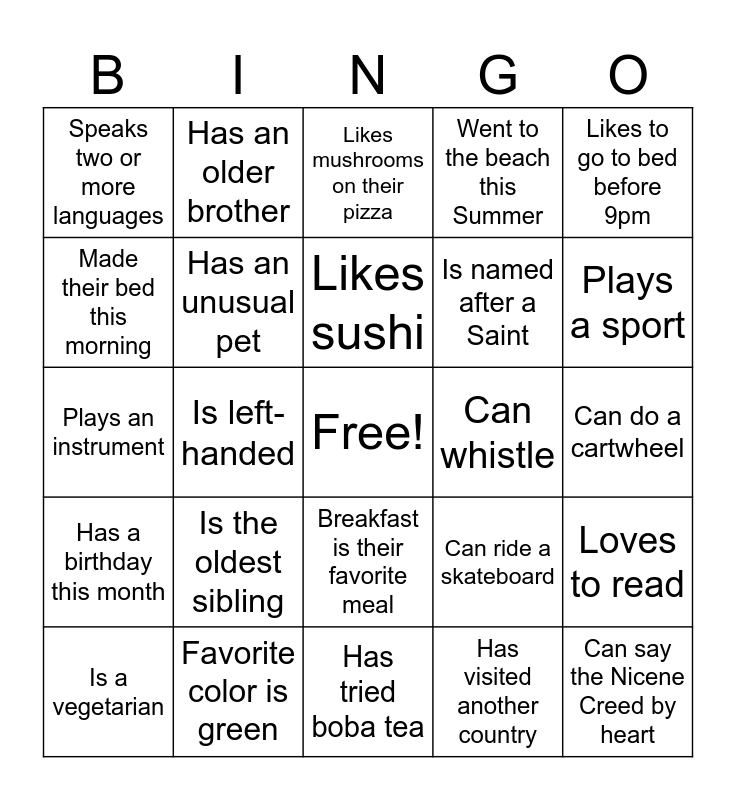 This bingo card has a free space and 24 words: Is the oldest sibling, Favorite color is green, Likes sushi, Is a vegetarian, Likes to go to bed before 9pm, Speaks two or more languages, Made their bed this morning, Has an older brother, Can whistle, Breakfast is their favorite meal, Is named after a Saint, Plays an instrument, Can ride a skateboard, Loves to read, Has an unusual pet, Has visited another country, Can do a cartwheel, Likes mushrooms on their pizza, Plays a sport, Is left-handed, Can say the Nicene Creed by heart, Has a birthday this month, Went to the beach this Summer and Has tried boba tea.
