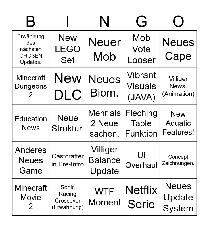 This bingo card has a free space and 24 words: Castcrafter in Pre-Intro, Sonic Racing Crossover (Erwähnung), Neues Biom., Minecraft Movie 2, Neues Cape, Erwähnung des nächsten GROßEN Updates., Minecraft Dungeons 2, New LEGO Set, Fleching Table Funktion, Villiger Balance Update, Vibrant Visuals (JAVA), Education News, UI Overhaul, Concept Zeichnungen., New DLC, Netflix Serie, New Aquatic Features!, Neuer Mob, Villiger News.(Animation), Neue Struktur., Neues Update System, Anderes Neues Game, Mob Vote Looser and WTF Moment.