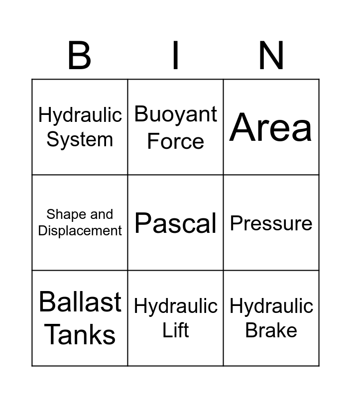 This bingo card has 21 words: Pascal’s Principle, Archimedes’ Principle, Buoyant Force, Displacement, Density, Ballast Tanks, Hydraulic System, Area, Pascal (Pa), Hydraulic Lift, Hydraulic Brake, Shape and Displacement, Buoyancy, Hydraulic Fluid, Pressure, High Density, Low Density, Volume, Pascal, ships and piston.