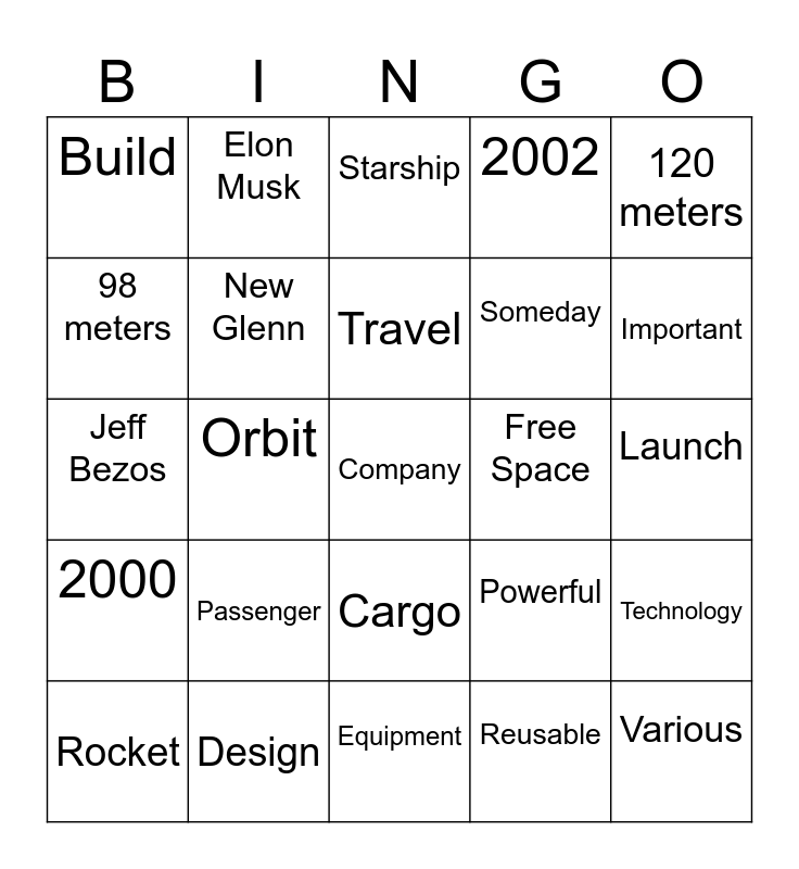 This bingo card has a free space and 24 words: Passenger, Design, Travel, Rocket, 120 meters, Build, 98 meters, Elon Musk, Free Space, Cargo, Someday, Jeff Bezos, Powerful, Technology, New Glenn, Reusable, Launch, Starship, Important, Orbit, Various, 2000, 2002 and Equipment.