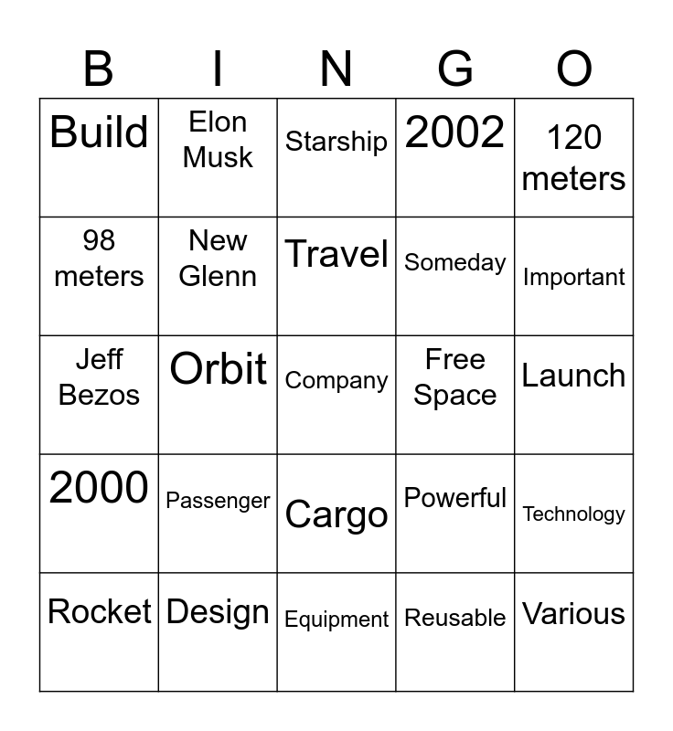 This bingo card has a free space and 24 words: Passenger, Design, Travel, Rocket, 120 meters, Build, 98 meters, Elon Musk, Free Space, Cargo, Someday, Jeff Bezos, Powerful, Technology, New Glenn, Reusable, Launch, Starship, Important, Orbit, Various, 2000, 2002 and Equipment.