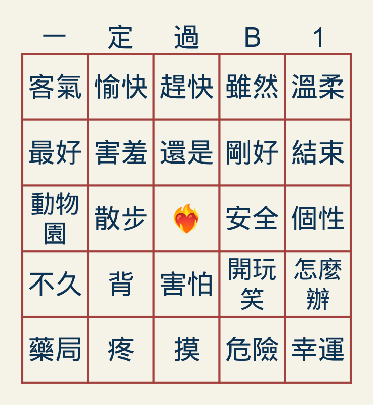 This bingo card has a free space and 24 words: 背, 疼, 還是, 藥局, 溫柔, 客氣, 最好, 愉快, 安全, 害怕, 剛好, 動物園, 開玩笑, 怎麼辦, 害羞, 危險, 個性, 趕快, 結束, 散步, 幸運, 不久, 雖然 and 摸.