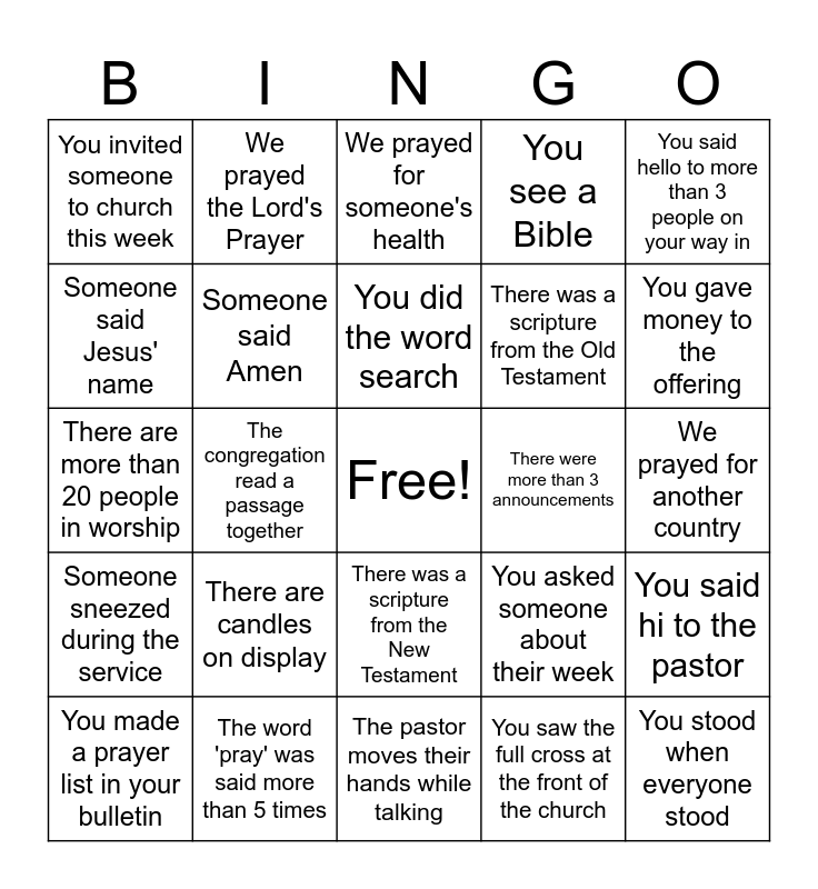 This bingo card has a free space and 24 words: There are candles on display, The word 'pray' was said more than 5 times, You did the word search, You made a prayer list in your bulletin, You said hello to more than 3 people on your way in, You invited someone to church this week, Someone said Jesus' name, We prayed the Lord's Prayer, There were more than 3 announcements, There was a scripture from the New Testament, There was a scripture from the Old Testament, There are more than 20 people in worship, You asked someone about their week, You said hi to the pastor, Someone said Amen, You saw the full cross at the front of the church, We prayed for another country, We prayed for someone's health, You gave money to the offering, The congregation read a passage together, You stood when everyone stood, Someone sneezed during the service, You see a Bible and The pastor moves their hands while talking.