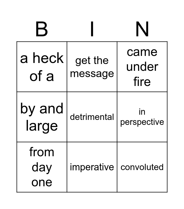 This bingo card has a free space and 8 words: in perspective, came under fire, get the message, from day one, a heck of a, convoluted, by and large and imperative.