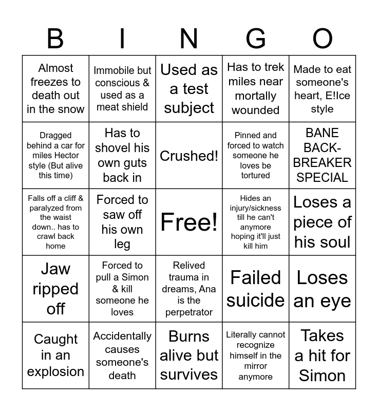This bingo card has a free space and 24 words: Caught in an explosion, Forced to pull a Simon & kill someone he loves, Crushed!, Literally cannot recognize himself in the mirror anymore, Made to eat someone's heart, E!Ice style, Almost freezes to death out in the snow, Immobile but conscious & used as a meat shield, Used as a test subject, Hides an injury/sickness till he can't anymore hoping it'll just kill him, Loses a piece of his soul, Falls off a cliff & paralyzed from the waist down.. has to crawl back home, Has to shovel his own guts back in, Failed suicide, Loses an eye, Dragged behind a car for miles Hector style (But alive this time), Accidentally causes someone's death, Burns alive but survives, Has to trek miles near mortally wounded, BANE BACK-BREAKER SPECIAL, Jaw ripped off, Forced to saw off his own leg, Relived trauma in dreams, Ana is the perpetrator, Pinned and forced to watch someone he loves be tortured and Takes a hit for Simon.