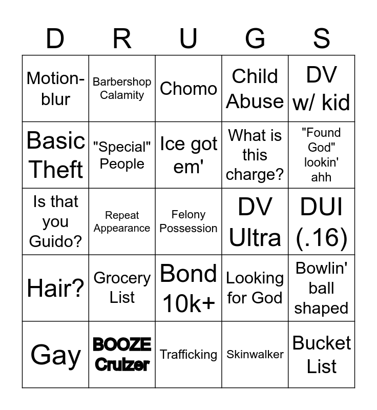 This bingo card has a free space and 69 words: DUI (.08), DUI (.16), No License, No Headlight, BOOZE Cruizer, Unknown, Child Abuse, DV, DV w/ kid, Hag Lookin', Bowlin' ball shaped, Chieftain, Motion-blur, Chomo, Murder, Repeat Appearance, Bond 10k+, What is this charge?, Haz Hazelnut, Hair?, DV Ultra, Looking for God, "Found God" lookin' ahh, Auto theft, Related (associated) Criminals, They're only 30!!, Pharaoh's Curse, Jesse, Stop cooking... (Slay queen), Skinwalker, (Dice roll intensifies), Barbershop Calamity, (Anyone says a racist remark), "I can fix them", Dwarf, Actual Crime, Deadly Weapon, Terrorism, Conspiracy, Basic Theft, Prolly a Neo Nazi, Grocery List, Bucket List, Theft 1k+, Embezzlement, Soul Read, Gay, n, Wild Card, Modern Art, "Special" People, Ice got em', Light Skin Stair, Embodiment of Meth, Trafficking, Rookie Crime, Shouldn't be a Crime, Lame Board, Goated Board, Lane Mimic, Is that you Guido?, County Change, Application for the Death Penalty, Juvenile, Nursing Home Gangster, Sober Traffic, Schrödinger's Car, Marus dyslexia, Bear and Leprechaun.