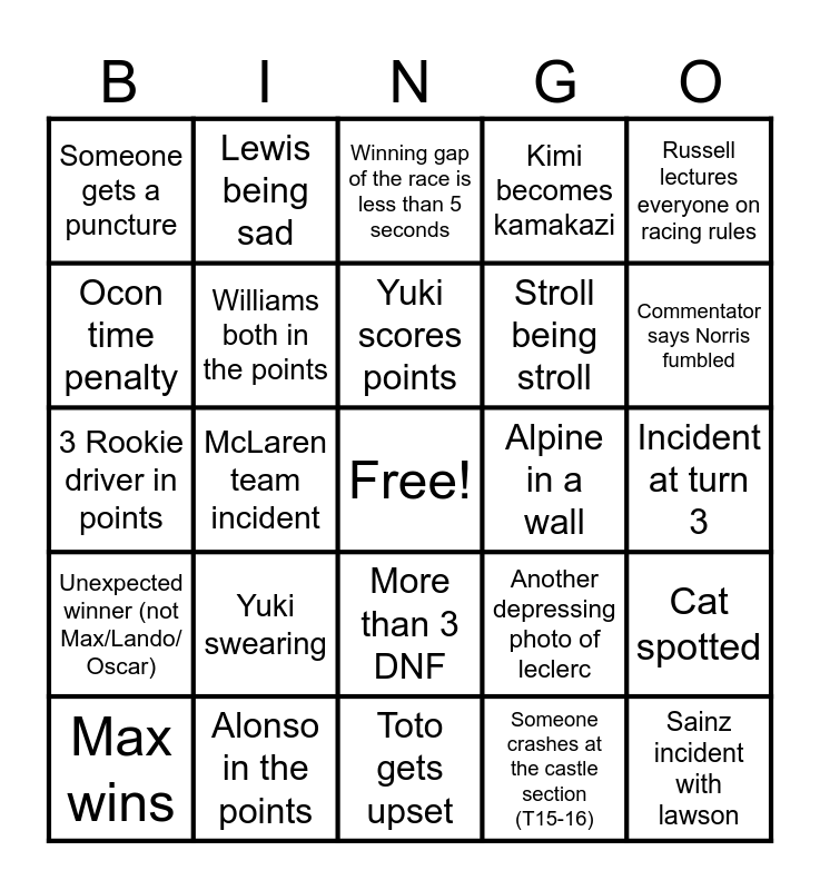 This bingo card has a free space and 29 words: Max wins, Racing bulls crash, McLaren team incident, Incident at turn 8, Someone gets a puncture, Winning gap of the race is less than 5 seconds, Williams both in the points, Yuki swearing, Alpine in a wall, Alonso in the points, Incident at turn 3, Sainz incident with lawson, Toto gets upset, Someone crashes at the castle section (T15-16), Commentator says Norris fumbled, Ferrari has funny radio message, More than 3 DNF, Unexpected winner (not Max/Lando/ Oscar), Russell lectures everyone on racing rules, 3 Rookie driver in points, Another depressing photo of leclerc, Sauber has the fastest pitstop, Stroll being stroll, Ocon time penalty, Kimi becomes kamakazi, Lewis being sad, Cat spotted, Yuki scores points and Top 3 different to quali.