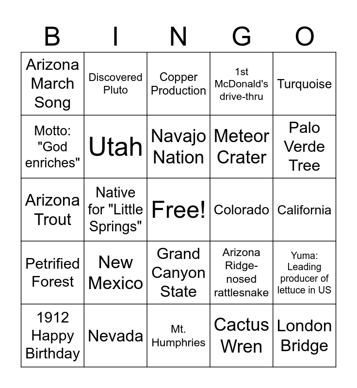 This bingo card has a free space and 29 words: 1912 Happy Birthday, 48th State, Native for "Little Springs", Saguaro Cactus Blossom, Arizona March Song, Copper Production, Utah, New Mexico, Colorado, Nevada, California, London Bridge, Mt. Humphries, Cactus Wren, Palo Verde Tree, Prickly Pear Cacti, Grand Canyon State, Petrified Forest, Turquoise, Arizona Trout, Arizona Ridge-nosed rattlesnake, State Fossil: Petrified Wood, Meteor Crater, Motto: "God enriches", 1st McDonald's drive-thru, Discovered Pluto, Yuma: Leading producer of lettuce in US, Navajo Nation and No Daylight Savings.